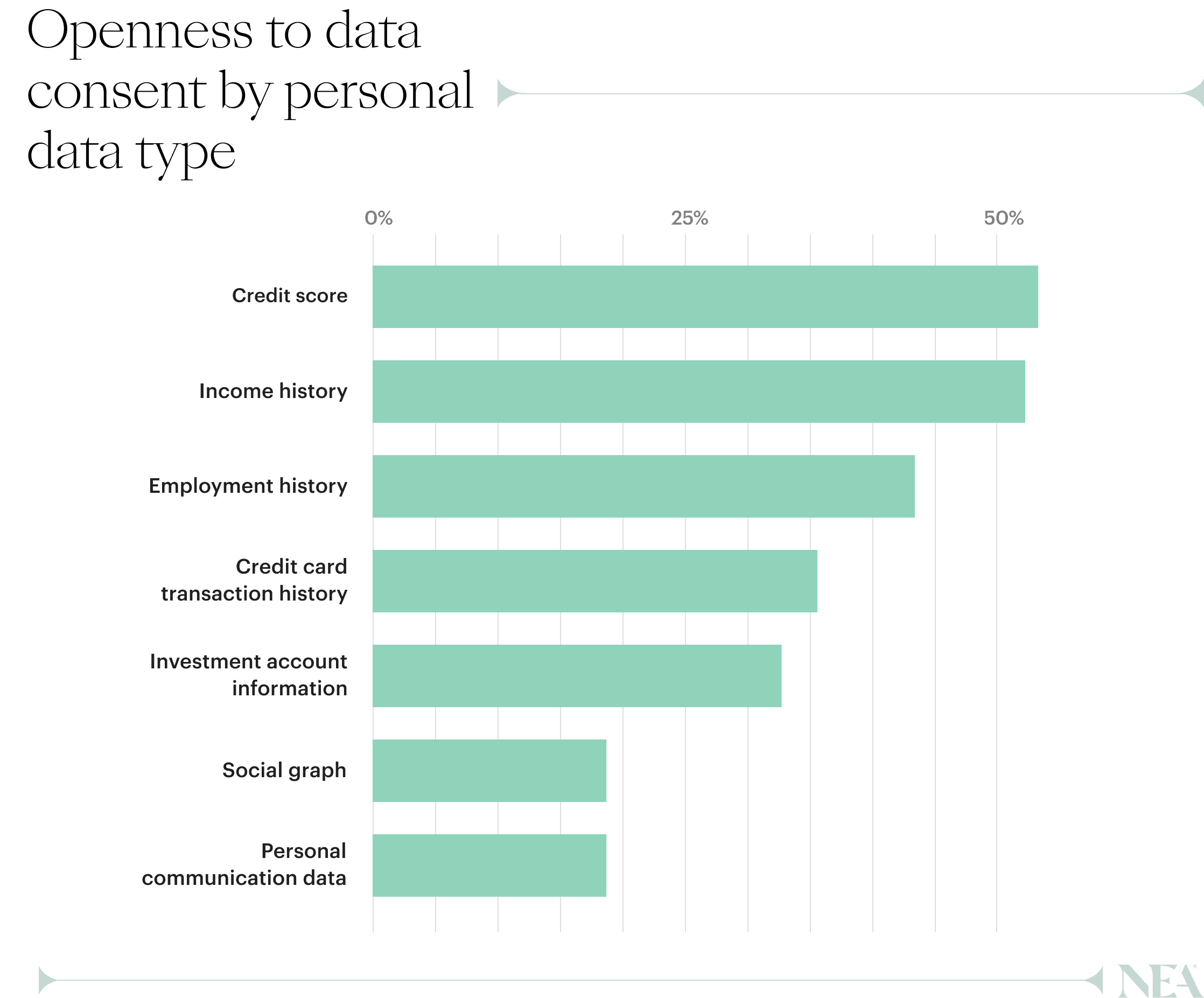 Panel openness (or lack thereof) demonstrates a difficulty in unlocking deeper levels of personalization. Consumers appear moderately open to sharing core financial data with understandable product outcomes; seemingly ancillary data that could inform deeper generative recommendations, behavior, or product experience will require more hand holding and trust building to access.