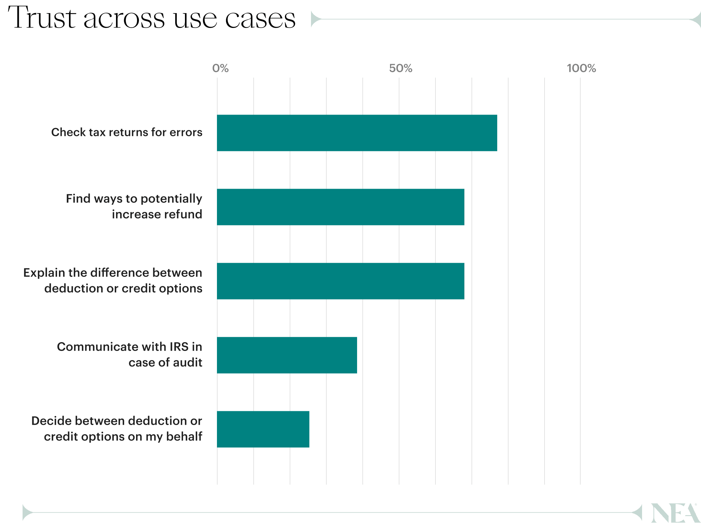 Implementation may be measured, but it’s still inevitable. Given the high regulatory barriers to enter and operate, it is worth identifying the most potential sources of value. Our consumer panel of US adults offers direction in two ways: value proposition and feasibility. As a case study on the broader application of generative AI to fintech platforms, the respondents answered questions about one universal category in specific, tax-filing (it is April after all).