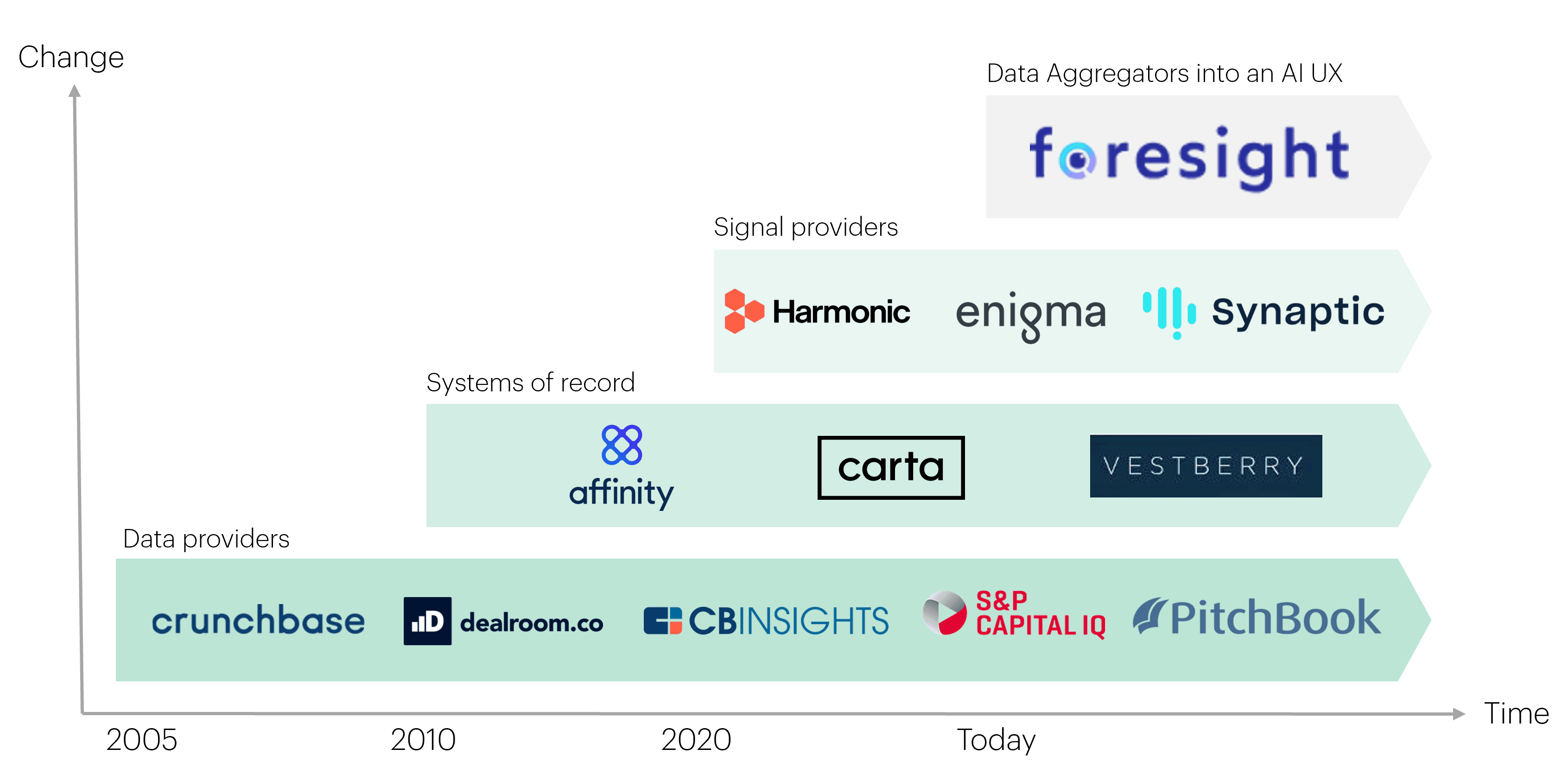 The early data era in the private markets was defined by platforms such as Crunchbase, PitchBook, and CapIQ—valuable for specific use cases, but limited. Then came system-of-record tools like Affinity and Carta. Now we’re seeing a new breed of intelligence platforms (think: Harmonic, Enigma, Synaptic) offering deep, structured insights that specialize in specific market signals, such as credit card swipes, employment shifts, intent signals.