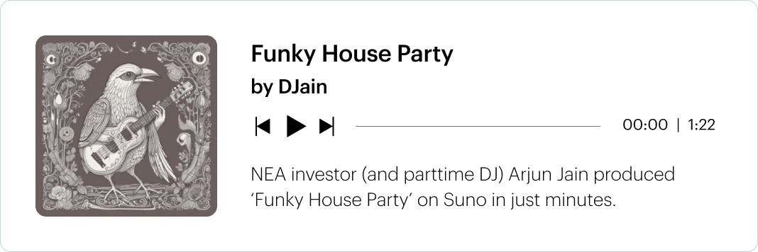 By our account, AI-generated music platforms productize three distinct consumer capabilities: the ability to make studio-grade music, the ability to personalize existing music or artistry, and the ability to produce otherwise improbable if not impossible musical combinations. While the underlying technology may be similar, these use cases are remarkably different. Our featured song (from our very own Arjun Jain) reflects personal interest in producing and sharing music; whereas, the thousands of videos on TikTok or Reels that leverage AI to produce unlikely remixes or covers (say Squidward singing the Beatles or the presidential candidates in a rap battle) are largely comedic.