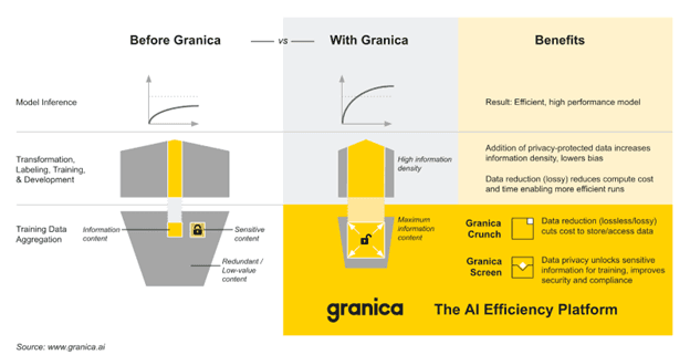 The rise of AI has driven growth in the data needed to pre-train, finetune, prompt-tune, and inference models in production, along with exploding costs across the emerging AI stack that are linked to the quantity & heterogeneity of data, size of models (parameters from the many billions to 1T+), time spent fixing model misbehaviors & drifts, and general complexity in scaling & deploying AI. Much of these costs are fundamentally driven by data inefficiency, as training data with low information value has proliferated. Such data often contains significant redundancy and sensitive information including personally identifiable information (PII) that increase costs, legal/compliance risk, and the time it takes to move data through the AI pipeline. Cutting these inefficiencies requires a new layer in the AI stack purpose-built to reduce redundant, low value, and sensitive data while increasing information density and improving the bias & performance of models. Granica is building this efficiency layer across the AI stack.
