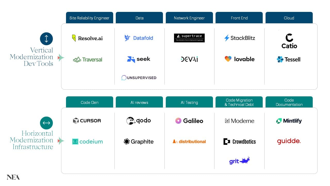 We have been so energized by the teams we’ve met building in this space to date, and we believe there are clear opportunities to modernize both across verticalized engineering domains and broadly across the engineering workflow. Value capture will centralize around companies which build sticky enterprise platforms that revolve around recurring modernization. If you’re a founder working on disruptive horizontal or verticalized code modernization tooling, we’d love to hear from you—please reach out: mfaulkner@nea.com and mgarg@nea.com
