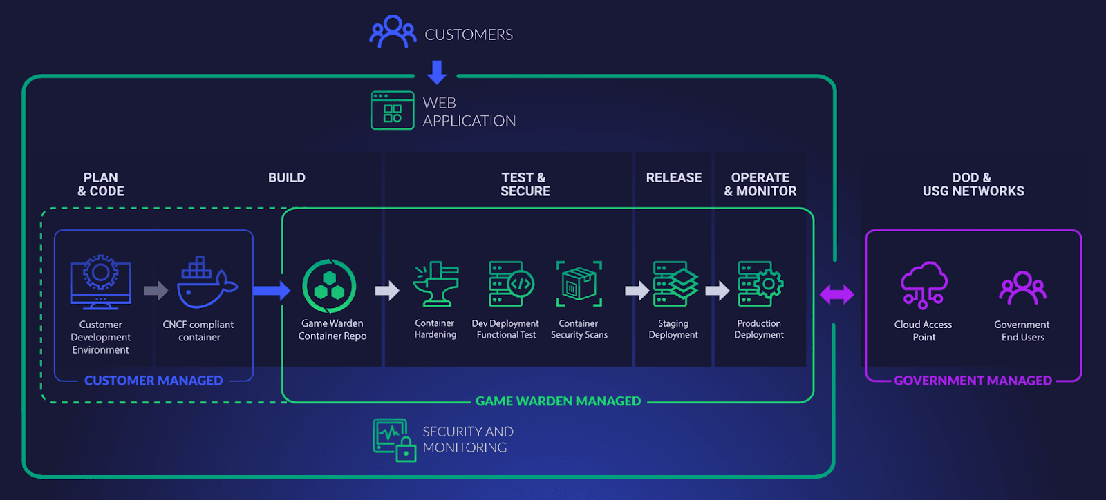 Customers begin their onboarding journey with a technical review of their application via a CSM. They then upload their application container into the Game Warden Container Repo which hardens the images through a battery of security scans and tests before allowing the containers to be deployed into staging or production environments. Future updates and releases can be completed in a continuous fashion according to modern CI/CD practices without requiring a vendor to recertify their ATO. The vendor also doesn’t need to worry about assembling a devops team to scale the application as Game Warden includes an SRE team for Day Two operations, covering everything from incident response to logging to reporting.