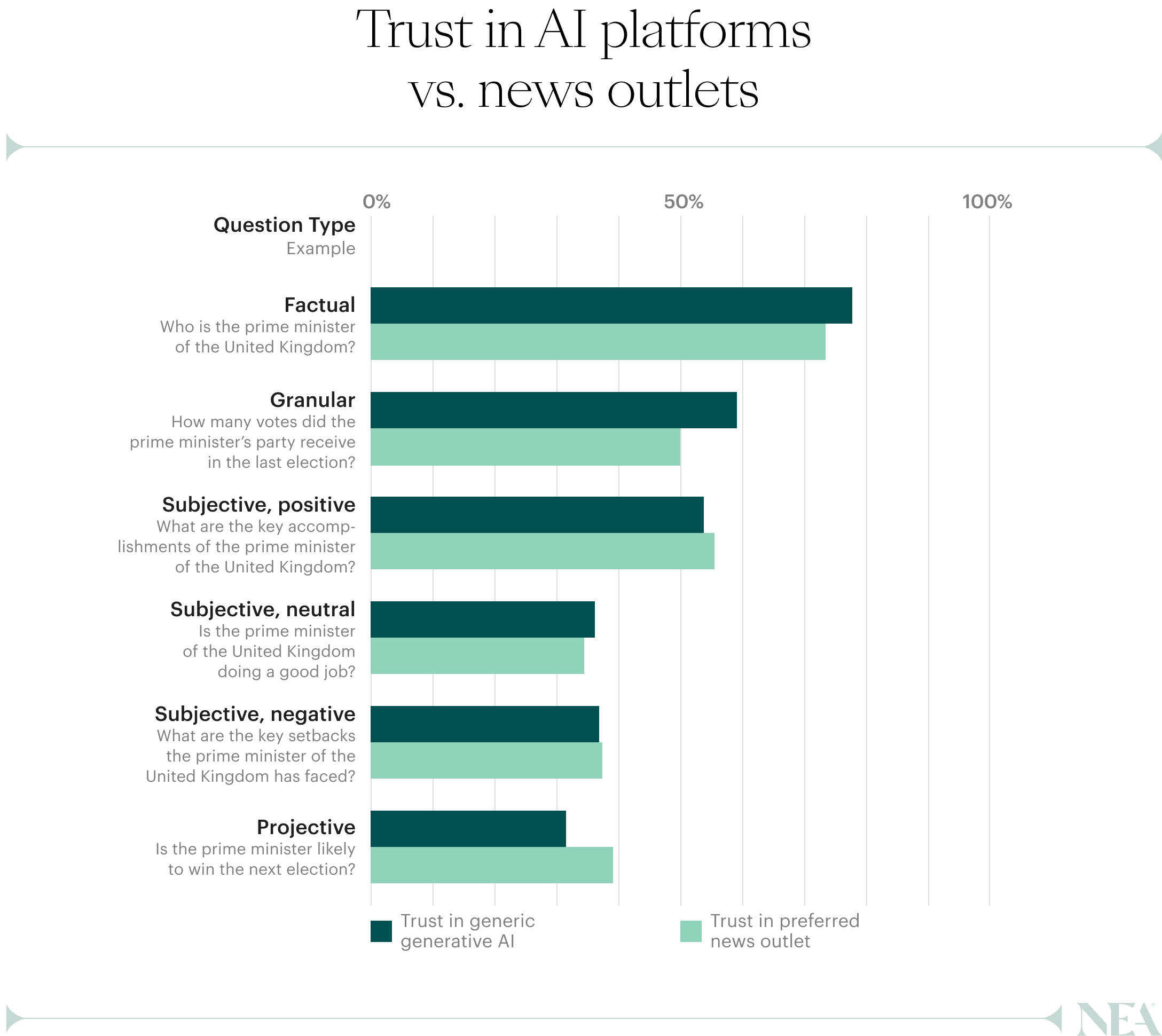 The consumer perspective can inform product decisions across applications beyond news. A fintech copilot, for instance, might need to cite sources or trigger human confirmation when making projections or fielding subjective inquiries. A mental health AI clinician might need to supplement its responses with clinical data to improve trust when answering granular medical questions.