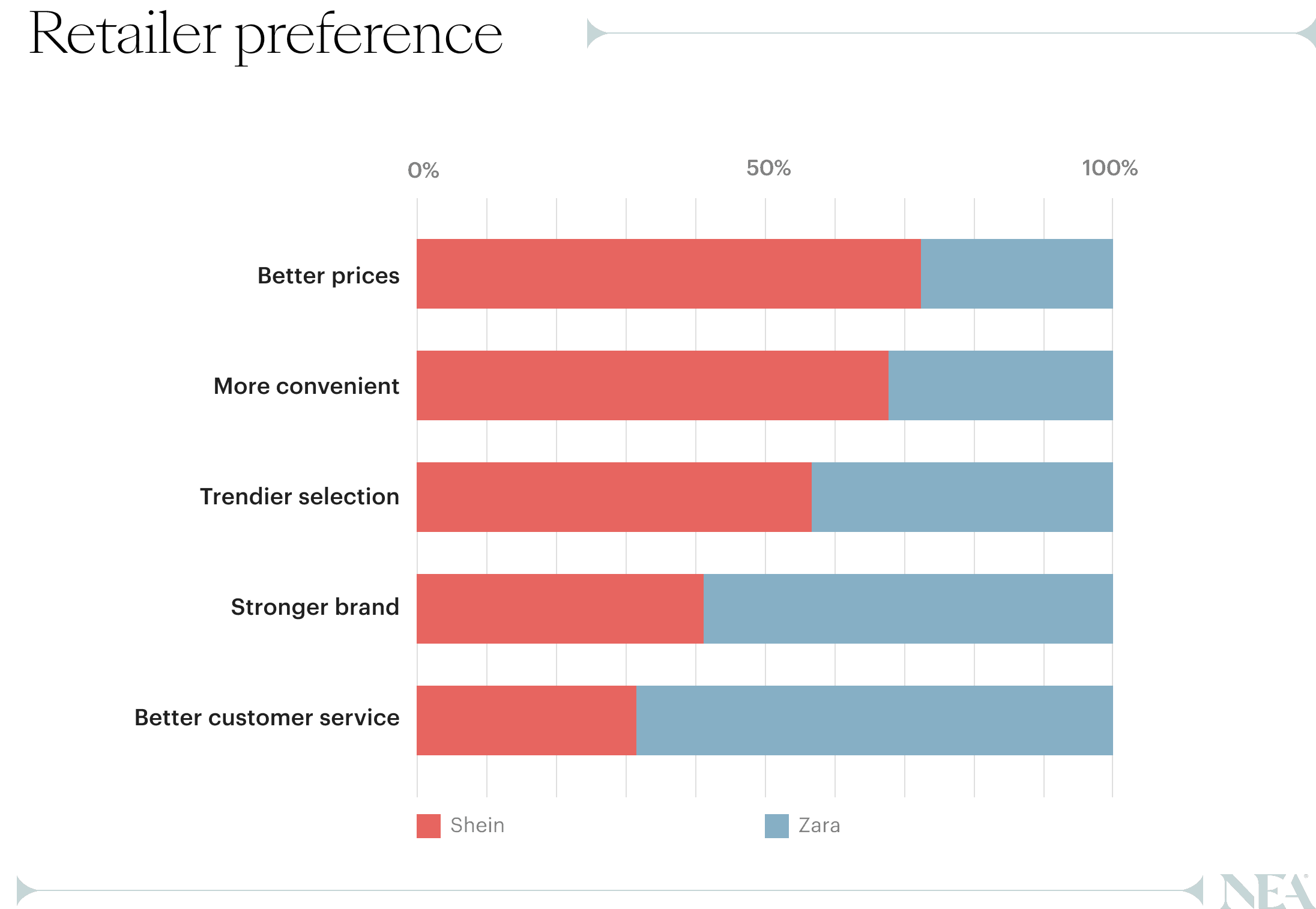 How can merchants translate the success of Shein into their own business – and how commerce enablement software can support that translation – first requires answering a more fundamental question. What do consumers value about Shein in the first place? To uncover relative value, a panel of adult consumers in the United States familiar with Shein and Zara compared the two across purchasing criteria: